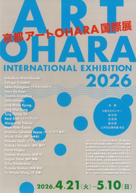 「大原はるまつり2026京都-Artist’s Spring Fes 2026 Ohara Kyoto」は、アーティストたちが作品や行為を持ち寄り、京都大原の地で作品を通して交流する展覧会です。 昨年まで「アートOHARA国際展」でしたが、今年からは、Air大原Galleryで開催される「大原はるまつり2026京都」と大原文化センターで開催される「京都アートOHARA国際展」に分かれて開催されます。